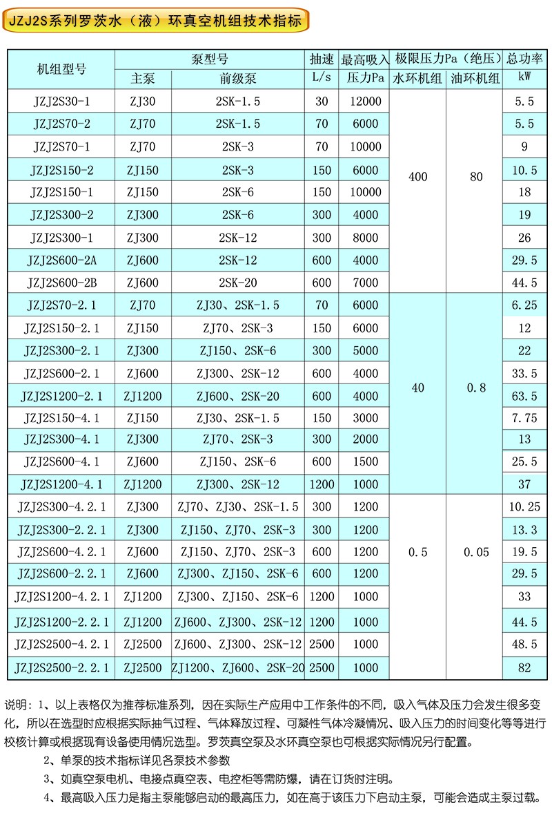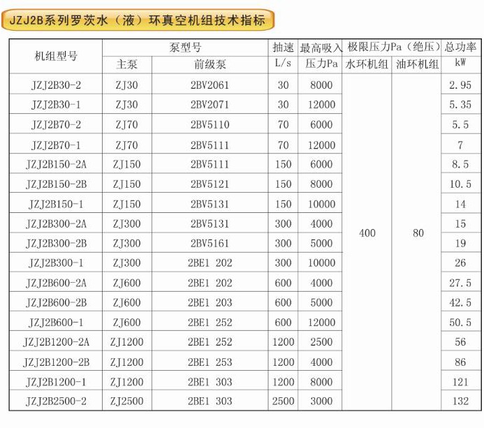更寬,但其所消耗的功率也更大。如果能確認被抽系統的工作壓力<2000Pa時,應優先選用JZJ2B300 -4.1機組