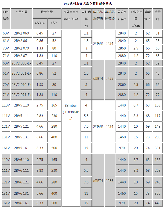 2BV系列水環真空泵適用于抽除氣體和水蒸氣,吸氣壓力可以達到33mbar絕壓(97%真空度)。當水環真空泵在吸氣壓力接近極限真空(工作液的飽和蒸汽壓)下長期工作時,應聯接汽蝕保護管,以對泵進行保護。作為壓縮機用時,其壓力大至0.26MPa(絕壓)。2BV系列水環真空泵作為新一代節能型產品,其以性能及眾多優點將取代同性能的SK、2SK系列水環真空泵及W、WY、WL系列往復真空泵。