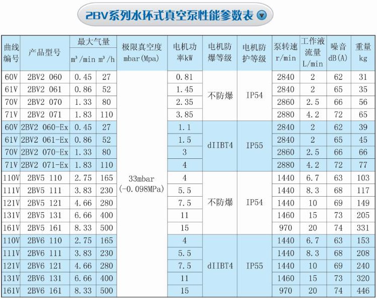 2BV系列水環(huán)式真空泵適用于抽出氣體和水蒸氣,吸氣壓力可以達(dá)到33mbar絕壓(97%真空度) 。當(dāng)水環(huán)真空泵在吸氣壓力接近極限真空(工作液的飽和蒸汽壓)下長期工作時,應(yīng)聯(lián)接汽蝕保護(hù)管,以對泵進(jìn)行保護(hù)。作為壓縮機用時,其壓力大至0.26MPa (絕壓)。2BV系列水環(huán)真空泵作為新一-代節(jié)能型產(chǎn)品,其以優(yōu)良的性能及眾多優(yōu)點將取代同性能的SK/2SK系列水環(huán)真空泵及W/WY/WL系列往復(fù)真空泵。2BV2- -Ex/2BV6系列水環(huán)式真空泵/壓縮機主要用于抽出爆炸性氣體,及各類易燃、易爆環(huán)境中工作,其性能參數(shù)與2BV2/2BV5系列相同。